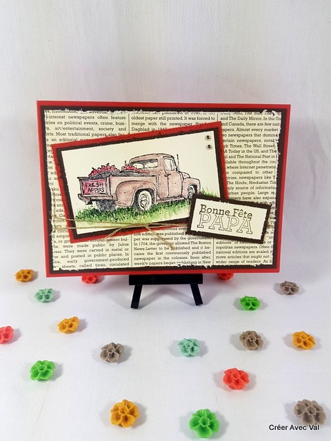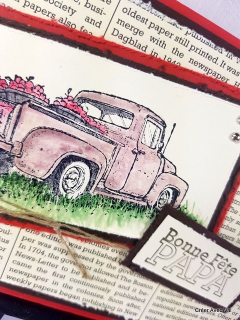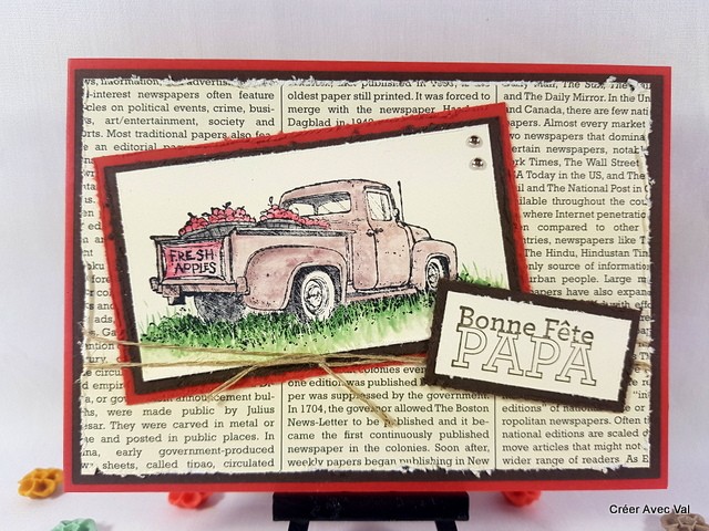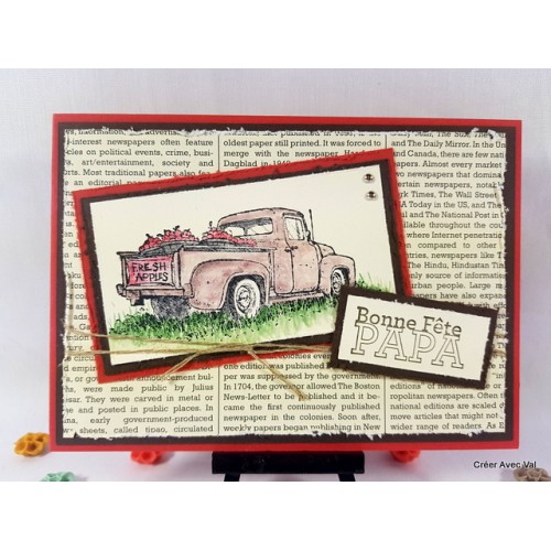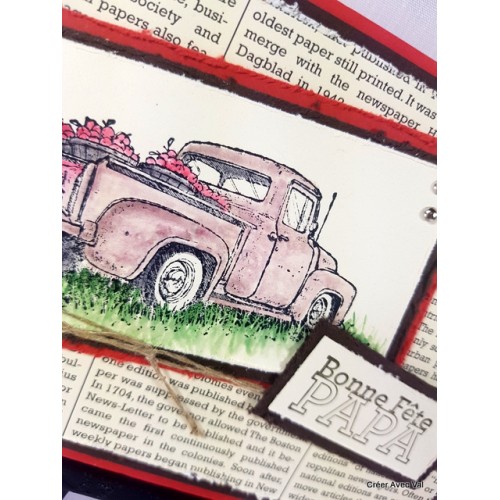 Différents fonds de carte sont superposé pour donner de la profondeur à la carte, le dernier fond est un papier imprimé "journal" et "abîme". Une étiquette avec le motif d'une vieille voiture qui est colorisé avec des encres. Une ficelle de lin traverse la carte et une étiquette "bonne fête papa" vient terminer le tout.