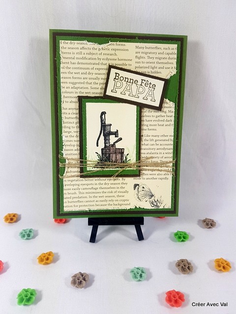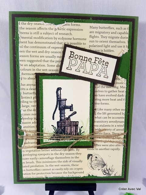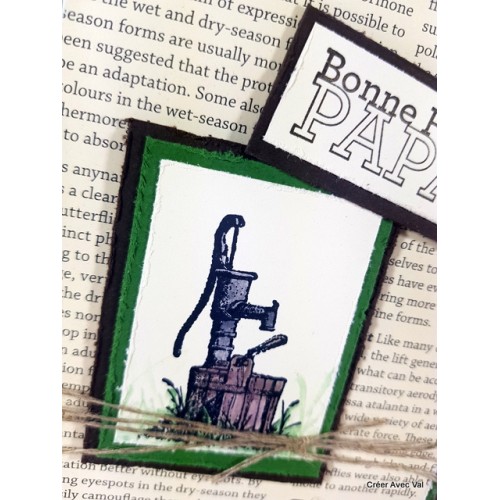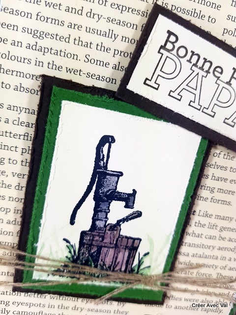 Différents fonds de carte sont superposé pour donner de la profondeur à la carte, le dernier fond est un papier imprimé "journal" et "abîme". Une étiquette avec le motif d'une pompe à eau au centre qui est colorisée avec des encres. Une ficelle de lin traverse la carte et une étiquette "bonne fête papa" vient terminer le tout.