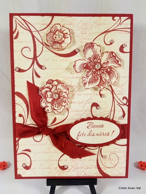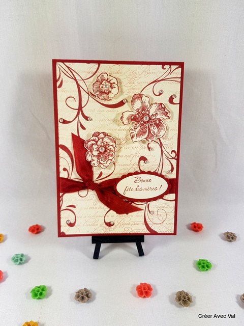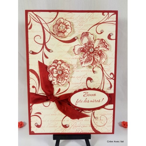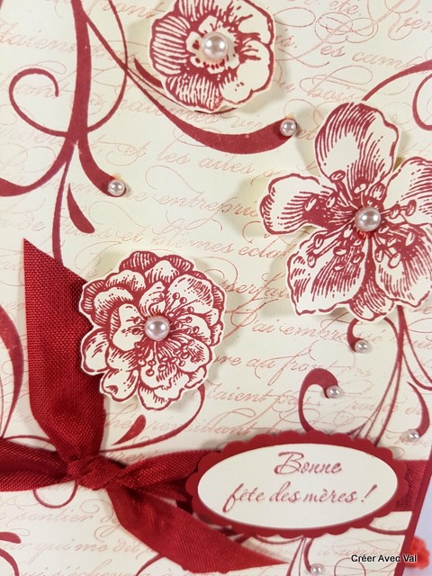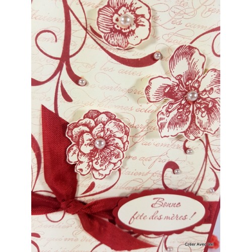 Cette carte et travailler avec des encres et des motifs différents pour lui donner un effet "vintage". Un ruban traverse complètement la carte pour finir avec un joli nœud, quelques perles parsemées ici et là pour finir la décoration.