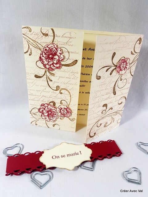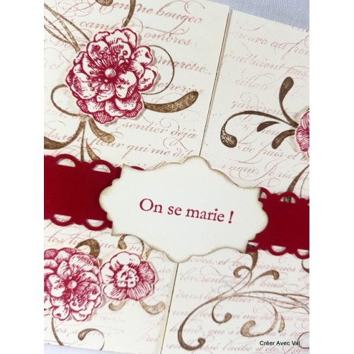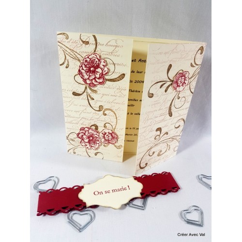 Dans les tons écrus, beige et rouge/bordeaux. Ouverture originale à deux volets. Décoration fait avec un fonds "écriture", quelques arabesque plus foncé et rehaussé de fleurs collées. La bande rouge/bordeaux qui sert de maintiens pour fermer le faire-part est agrémenté d'une étiquette avec les mots "on se marie!"