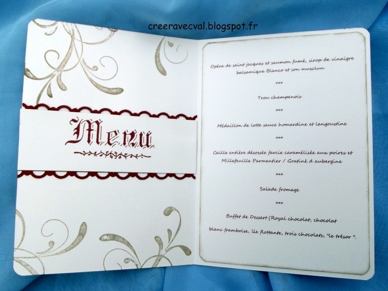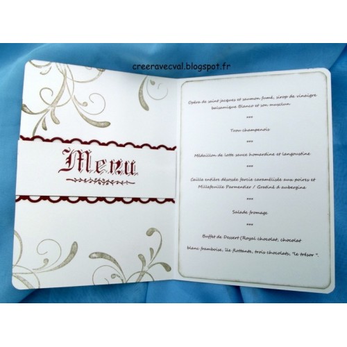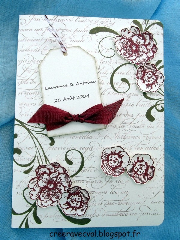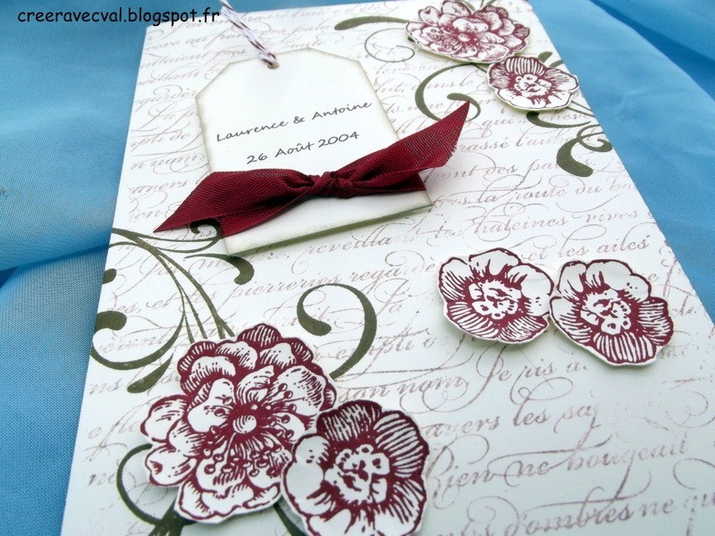 Dans les tons écru, beige et rouge/bordeaux, un fond "écriture", quelques arabesque plus foncé et rehaussé de fleurs collées.