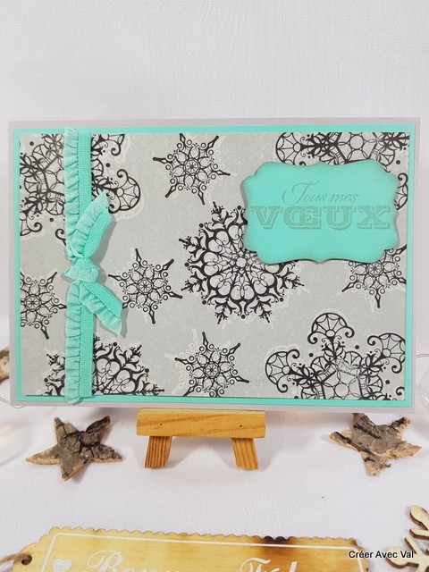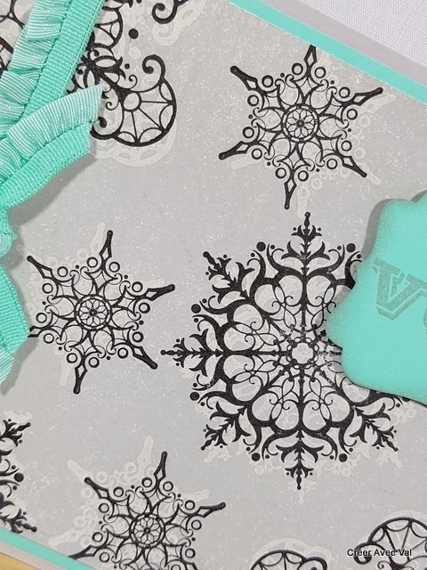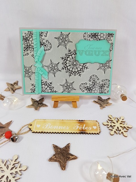 Carte avec des flocons de neige en effet "fantôme" avec un double encrage, un ruban et une étiquette avec les voeux pour agrémenter le tout.