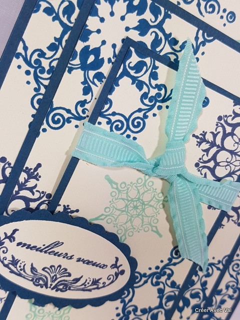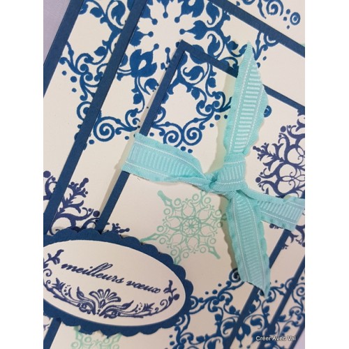 Carte dans les tons bleu et blanc sur trois épaisseurs de papiers, relevée d'un ruban et d'une étiquette pour les voeux.