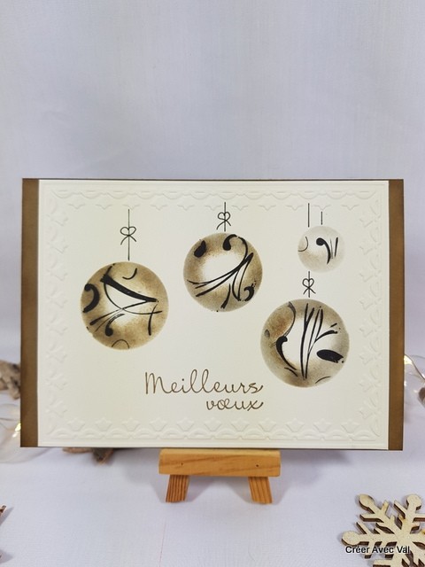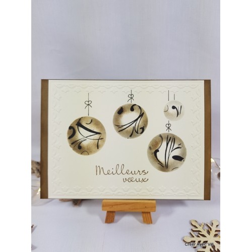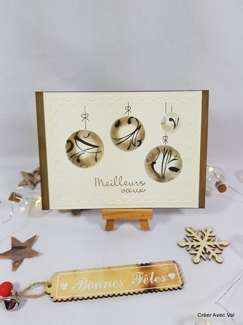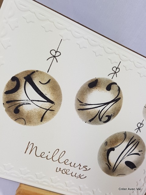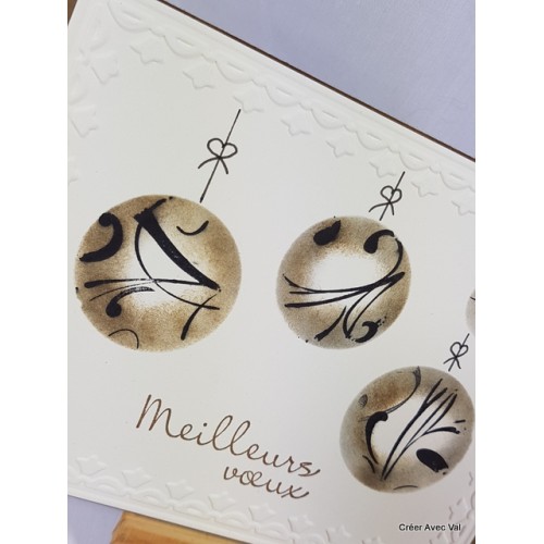 Le carton écru et décorer avec de l'embossage à froid puis un effet d'optique avec de l'encre pour créer ces boules de Noël suspendues.