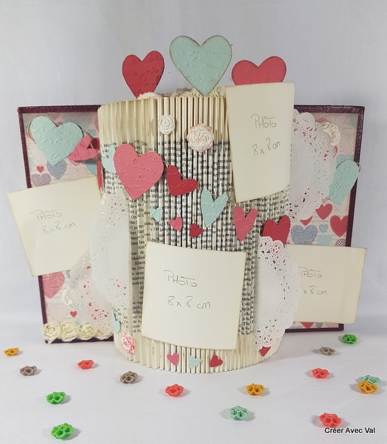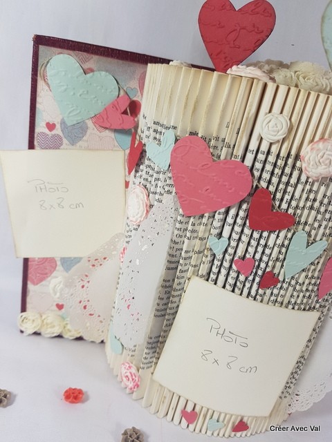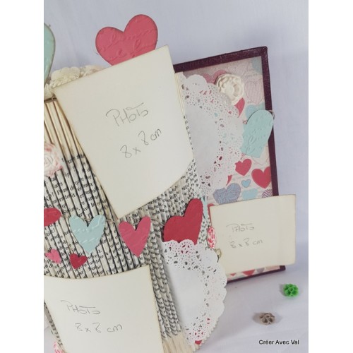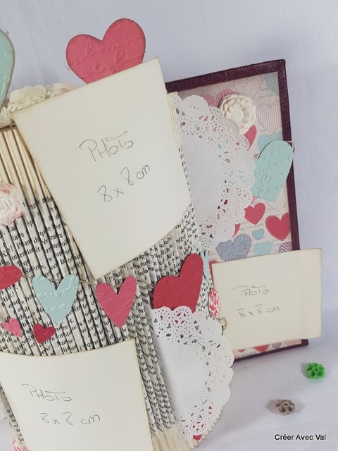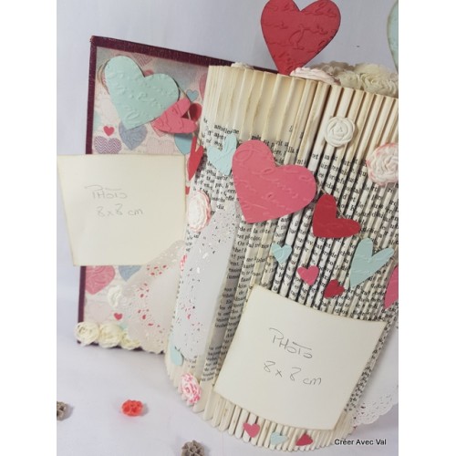 Une décoration originale, a posé, qui accueillera vos photos préférées, dans les tons, rouge, rose et bleu, une guirlande de coeurs traverse le livre, des fleurs, des boutons, des napperons pour agrémenter le tout.