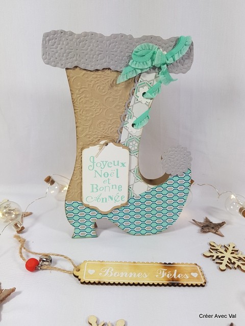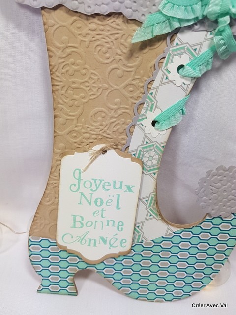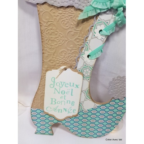 Une carte originale pour les fêtes de fin d'année en forme de botte, la partie du haut, la boule du bout de la botte et le fond de carte est embossé à froid. Un ruban de couleur bleue sert de lacet à la botte. Une étiquette mise en relief pour accueillir le vœu.