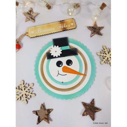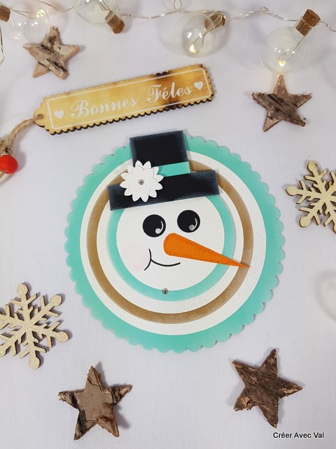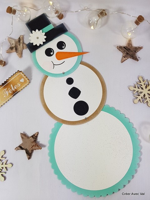 Carte télescopique à trois niveaux, en forme de bonhomme de neige. Dans les tons bleu et marron, elle sera idéale pour vos fêtes de fin d'année.
