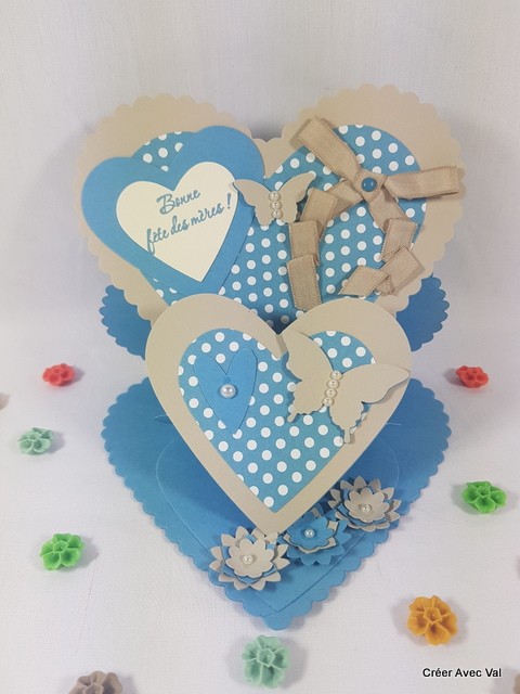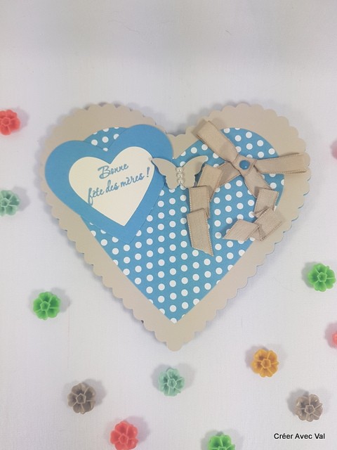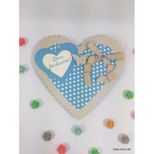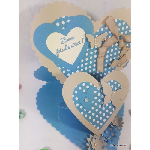 Une carte cœur pour exprimer tout votre amour à votre maman lors de la fête des mères. Dans les tons bleu et beige, elle est décorée de cœur, ruban, de papillons et Perle de nacre.