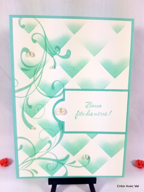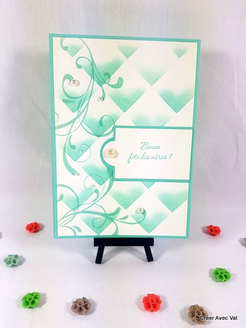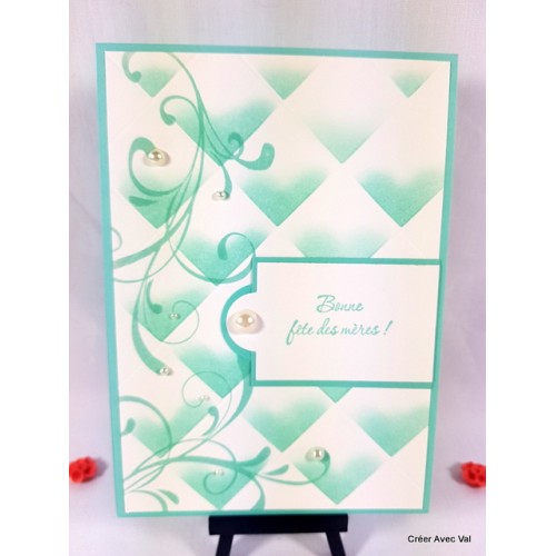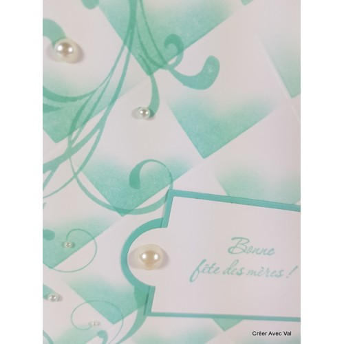 Une jolie carte toute en finesse et sobriété pour la fête des mères. Un encrage spécial pour égayer cette carte. Des perles de différentes tailles finissent la décoration.