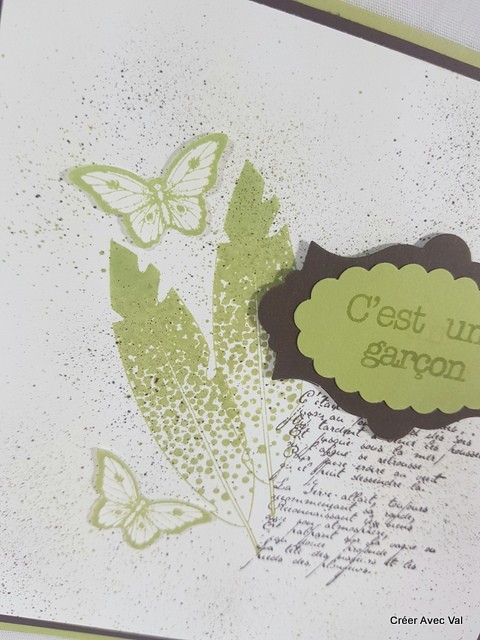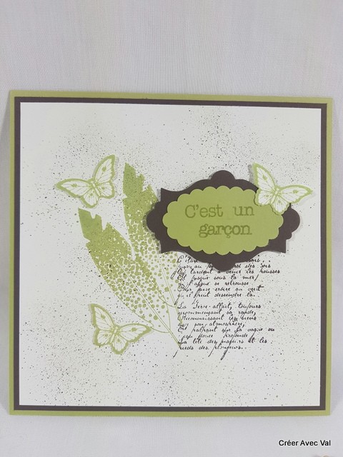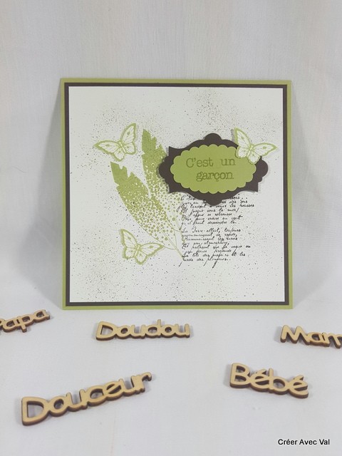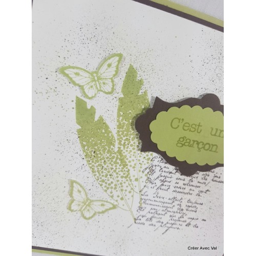 Le papier blanc est décoré avec des mini taches des écritures et des plumes. Une double étiquette est collée en 3D pour annoncer la naissance d'un petit garçon. Trois papillons collaient de-ci de là simplement en leur centre pour donner du volume au faire-part.