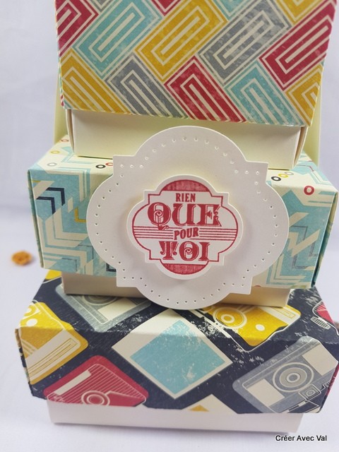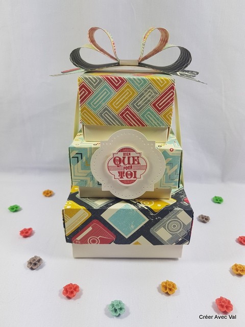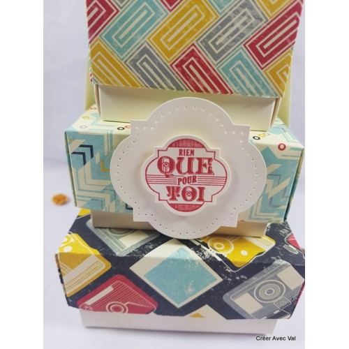 Ce lot se comporte de 3 boîtes, ainsi qu'un lien qui l'ait maintien ensemble. Celui-ci se termine avec un nœud assorti.