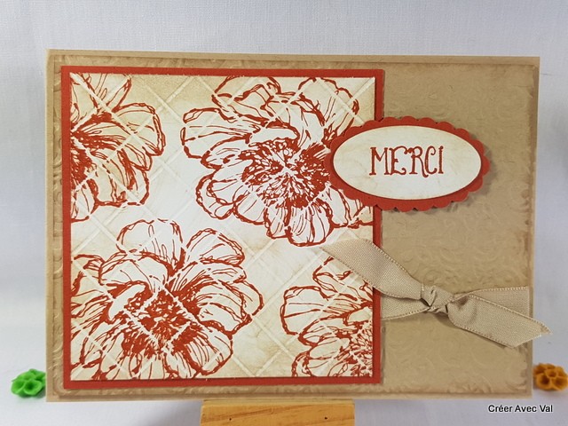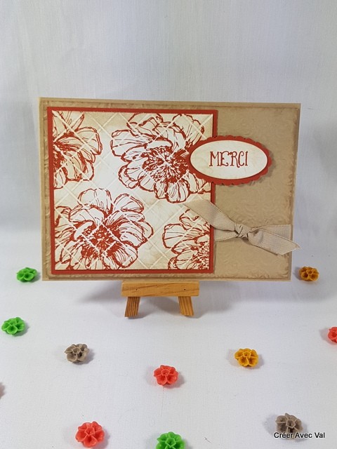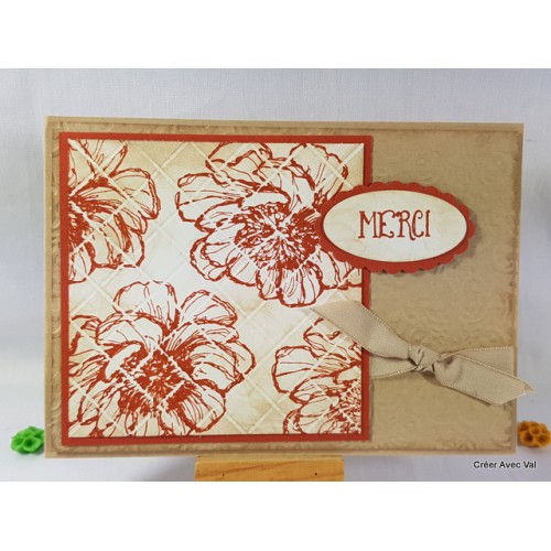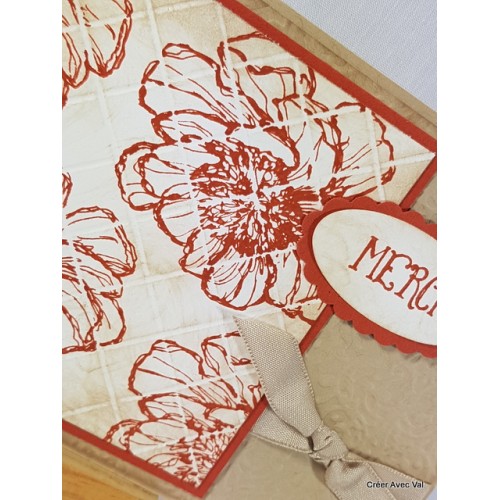 Une jolie carte toute en finesse et sobriété pour souhaiter nos remerciements. Une base de couleur kraft, une première fond embossé à froid, ensuite un fond blanc travailler de façon à faire une allusion de faux carrelage. Un ruban et une étiquette terminent la carte.