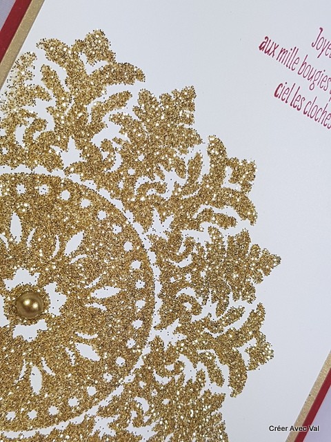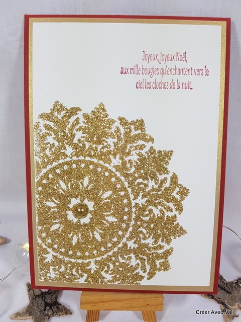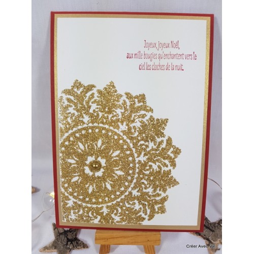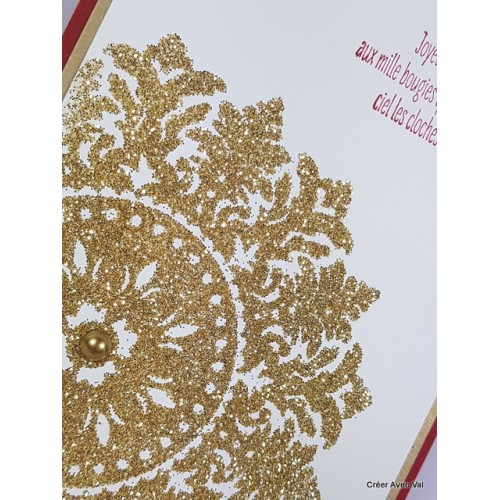 Cette carte dans les tons rouge, or et blanc. Une base de carte rouge, un premier fond où accueille un second fond blanc. Un motif de médaillon de couleur où est embossé et accueille une perle de couleur ou également au centre.