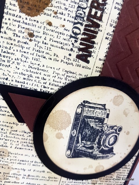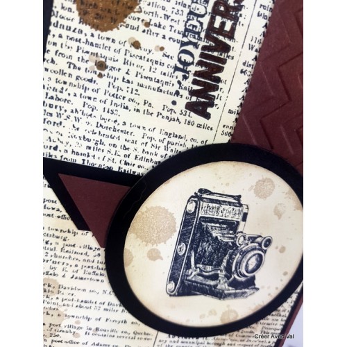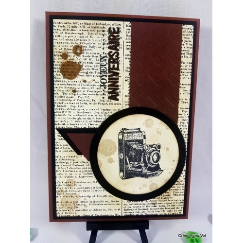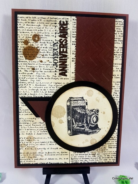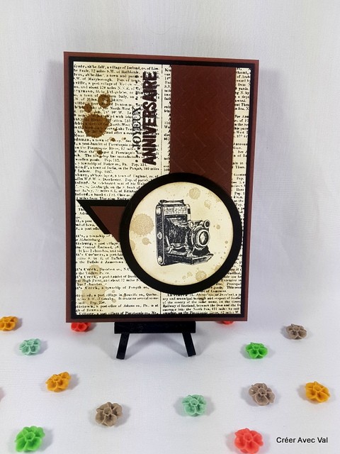 Cette carte dans les tons marrons et noir sera idéale pour souhaiter un joyeux anniversaire. une base de carte marron accueille un mat noir puis un papier vanille sur lequel j'ai travaillé le fond avec une étampe "écriture" des tâches ainsi que le voeu d'anniversaire. Sur ce dernier j'y suis collé différents éléments de déco ainsi qu'un rond avec un appareil photo.