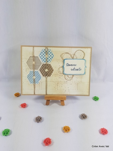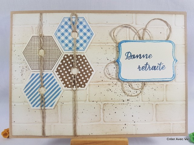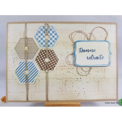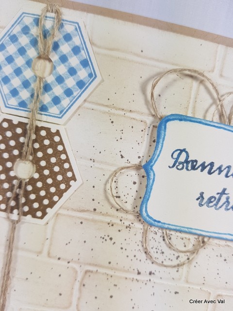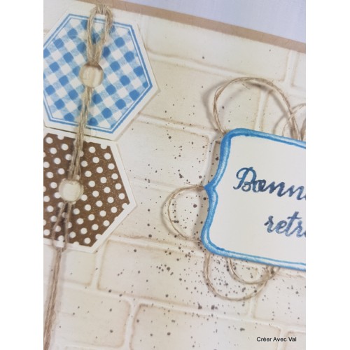Une base de carte "kraft" puis une mat vanille embossé à froid avec un effet faux mur, sur le dessus en trouve des découpes de faux boulons", une étiquette mise en 3D et du fil de lin.