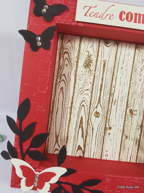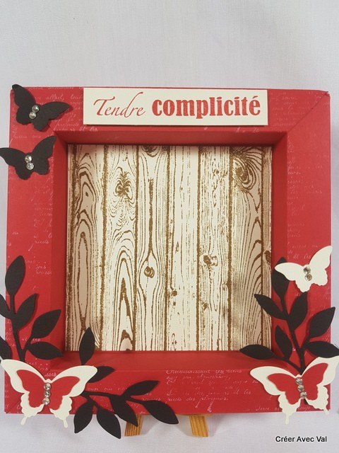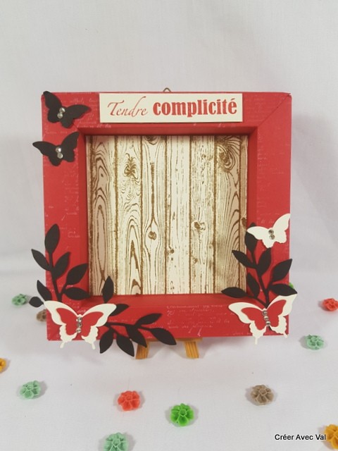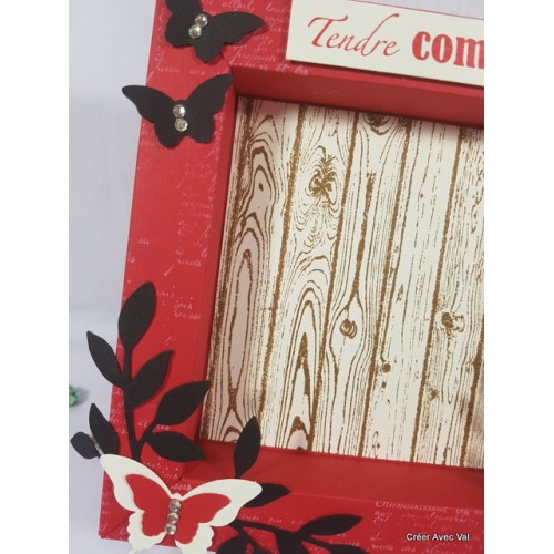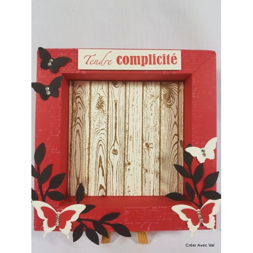 Un fond faux bois accueillera votre photo, des décorations feuillages, papillons décorent le pourtour, quelques strass pour simuler le corps des papillons. Pour finir une étiquette "tendre complicité" termine ce cadre.