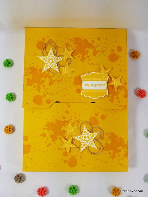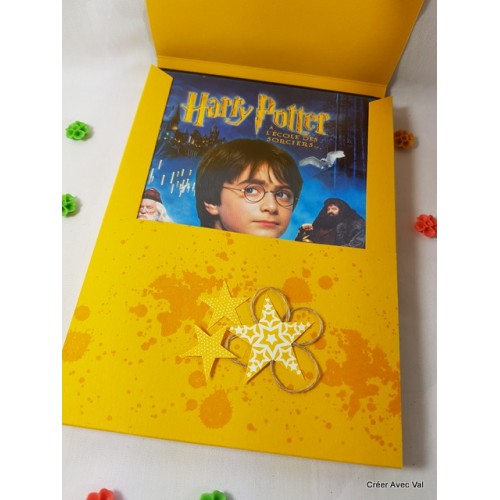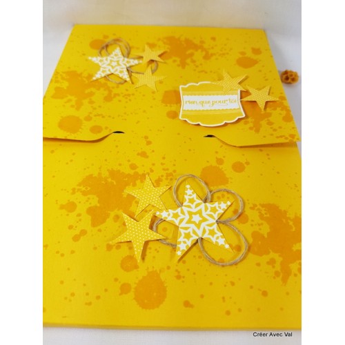 Cette pochette est idéale pour y glisser un DVD lors d'un cadeau. De couleur jaune, elle est décorée d'étoiles et de ficelle de lin ainsi que d'une étiquette avec la phrase "rien que pour toi".