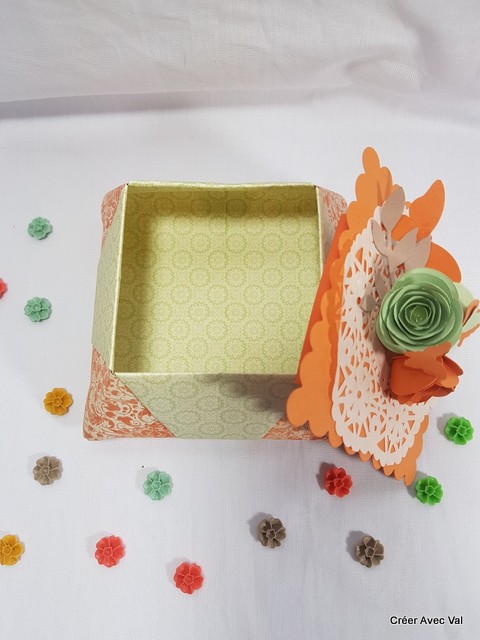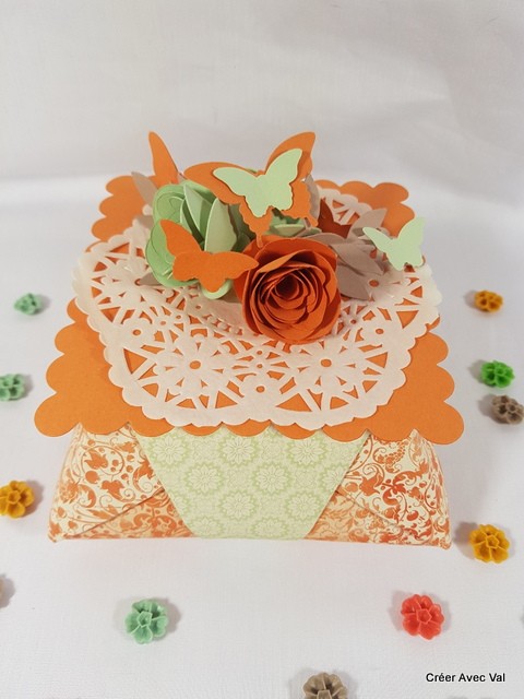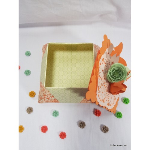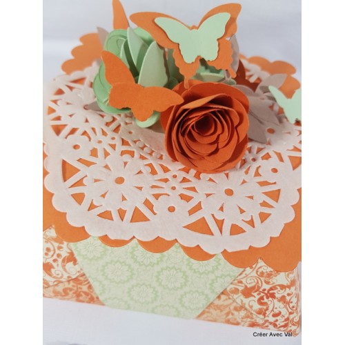 Une boîte de forme "ballotin" avec un couvercle amovible ... le dessus est décoré d'un napperon, de fleurs, de papillon et de feuillage.