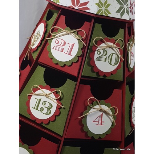 Ce calendrier de l'avent dans les tons rouge et vert mesure environ 40 cm, il accueille 24 petites boîtes de 3 dimensions différentes.