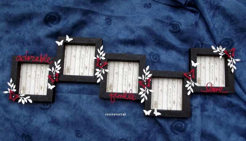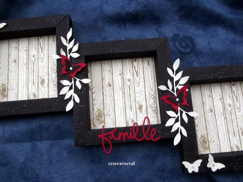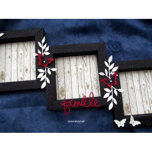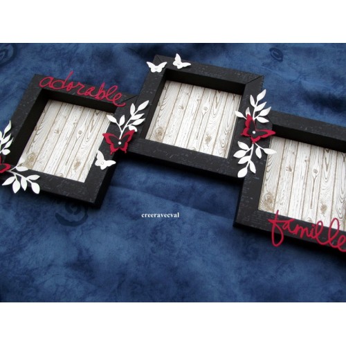 Un fond faux bois accueillera vos photos, des déco feuillages, papillons décorent le pourtour, quelques strass pour simuler le corps des papillons.