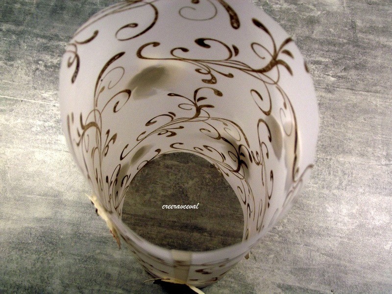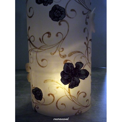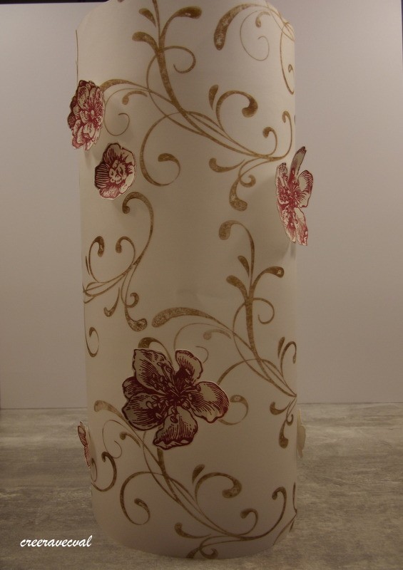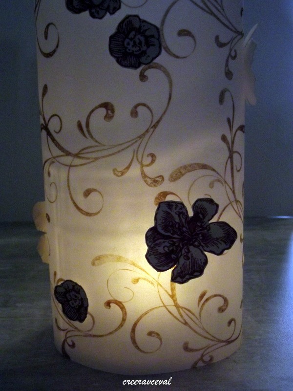 En papier velum pour la transparence, des tamponnage arabesque et quelques fleurs mise en relief pour la décoration.