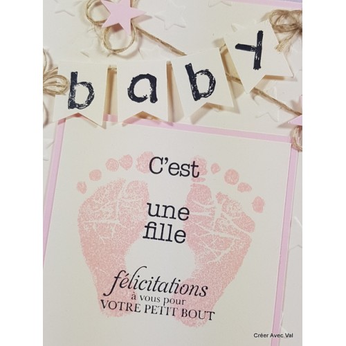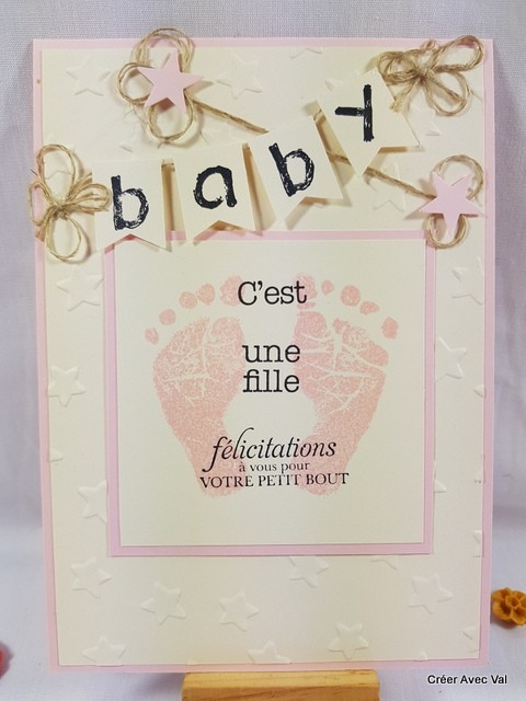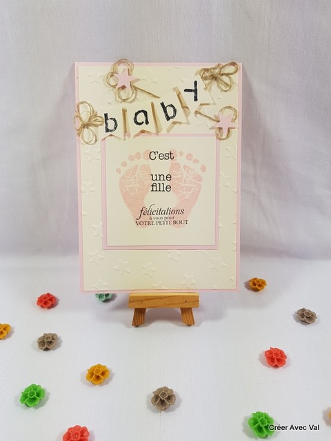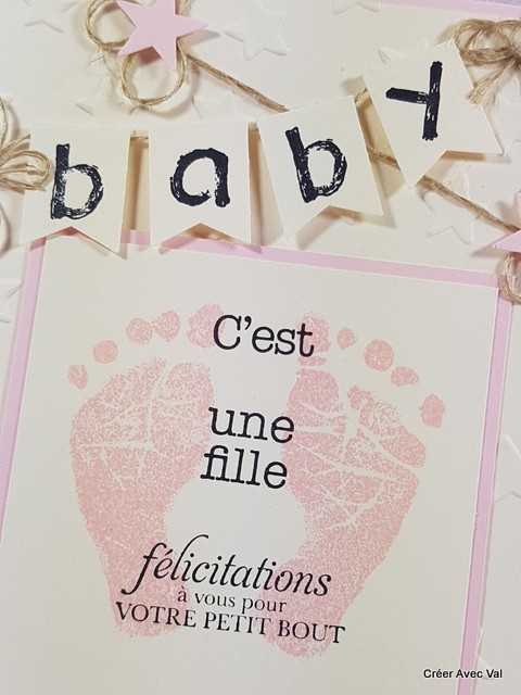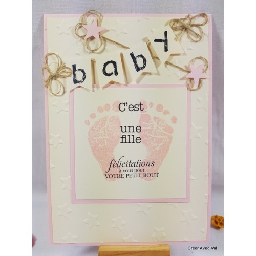 Le fond de carte rose accueille un premier fond embossé, puis un carré de papier sur la même base que le fond de carte où j'ai tamponné des empreintes de pieds ainsi qu'un texte de bienvenue pour bébé. Sur le haut de la carte se trouve une banderole avec le mot baby et quelques décorations terminent la carte.