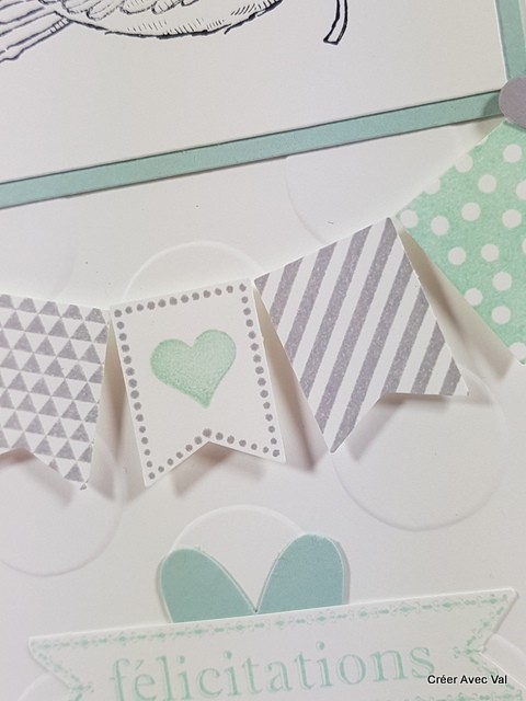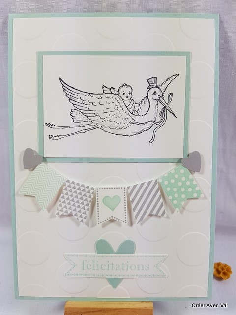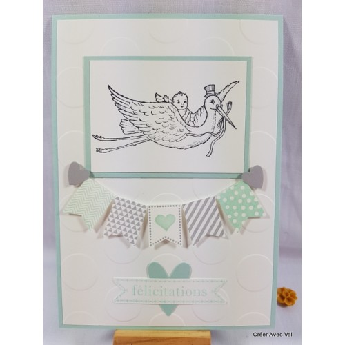 Le fond de carte bleu accueille un premier fond embossé, puis un carré de papier sur la même base que le fond de carte où j'ai tamponné une cigogne qui "porte" un bébé. Une banderole de fanions est sous ce tamponnage et sur le bas de la carte un cœur avec une étiquette félicitation pour finaliser la décoration.