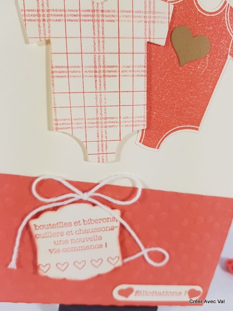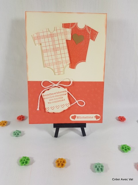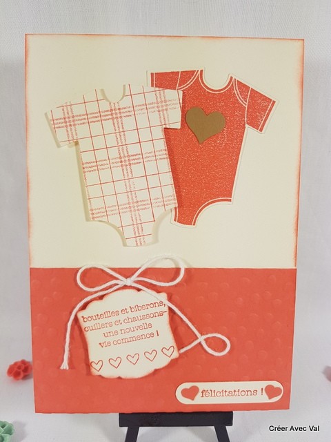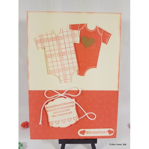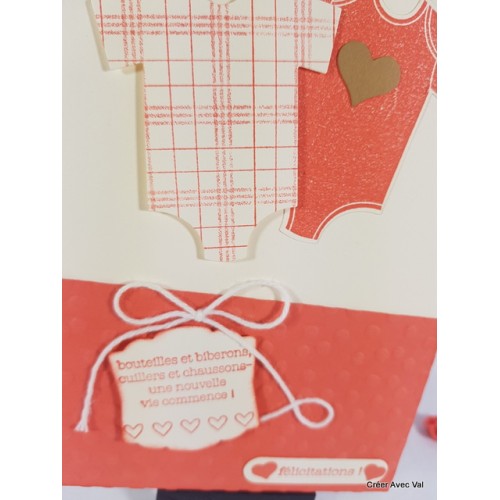 Le fond de carte vanille, accueille un premier papier embossé à froid sur 1/3 de la carte environ, où se trouvent deux étiquettes à message pour souhaiter la bienvenue de bébé. Sur le haut de la carte se trouve deux bodys aux motifs différents.