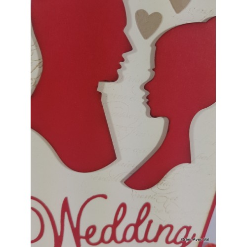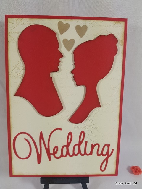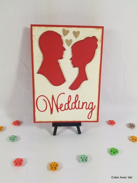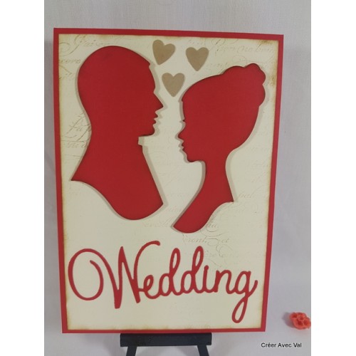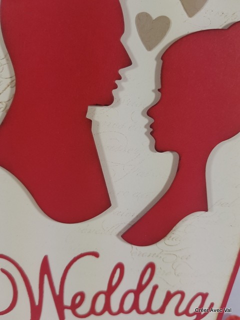 Une carte dans les tons beige et rouge pour souhaiter beaucoup de bonheur à des jeunes mariés. Une base de carte couleur rouge avec un premier mat beige sur lequel sont tamponnées des écritures plus ou moins légèrement pour donner un effet de profondeur, deux silhouettes sont collé en 3D. Pour finir trois petits cœurs sont collées sur le haut de la carte et le mot Wedding sur le bas de la carte.