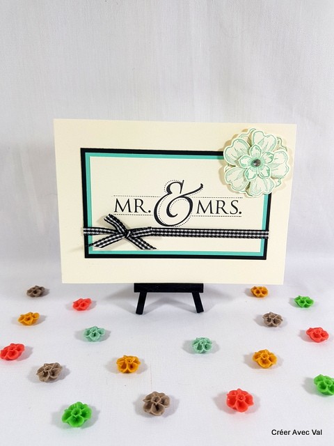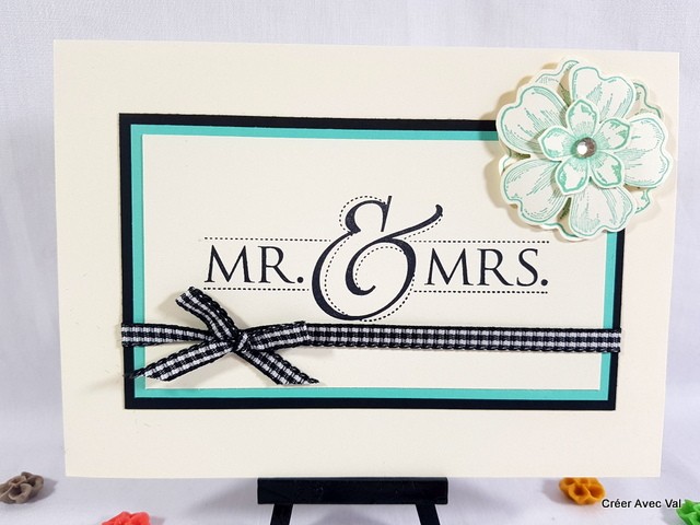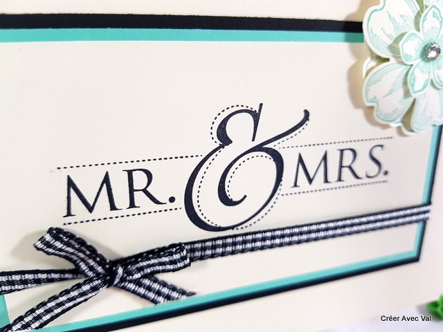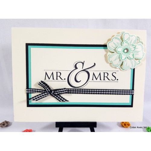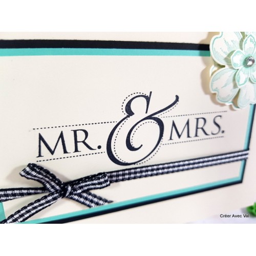Une carte dans les tons vanille, bleu et noir, pour souhaiter beaucoup de bonheurs à des jeunes mariés.