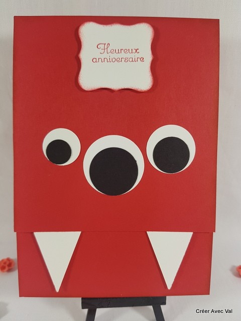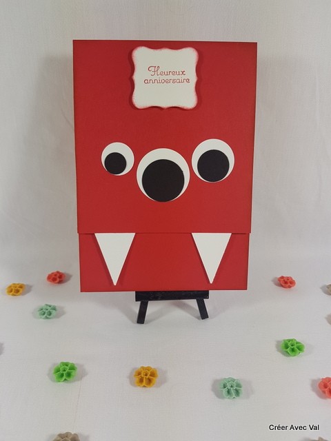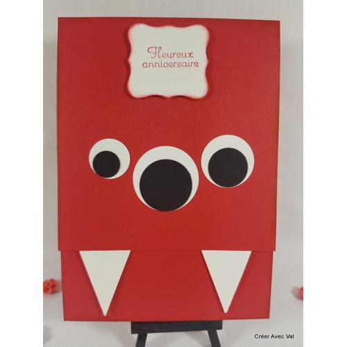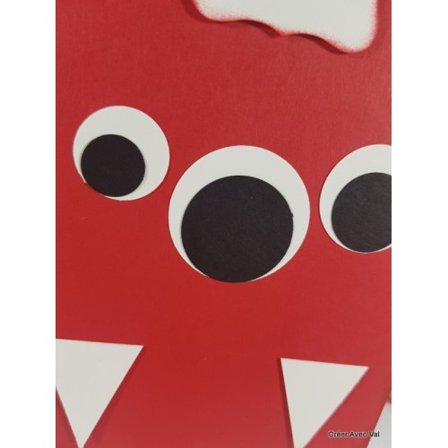 Cette carte représente un monstre, dans les tons rouge et blancs, elle sera idéale pour un enfant fan de monstres gentils.