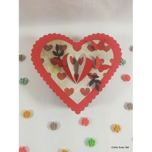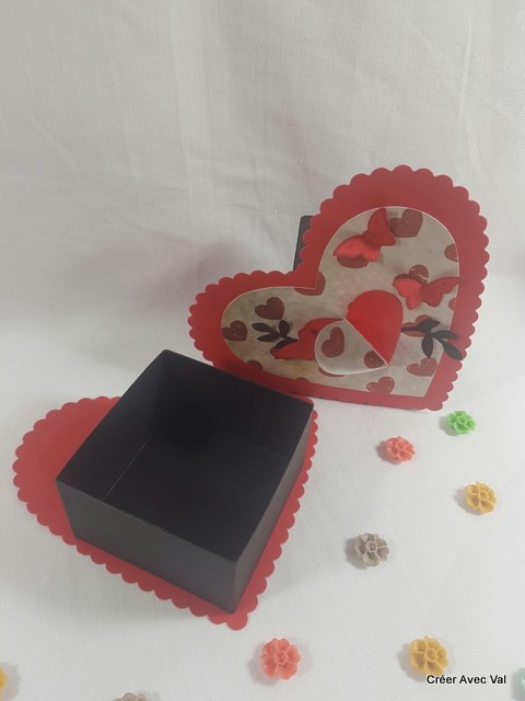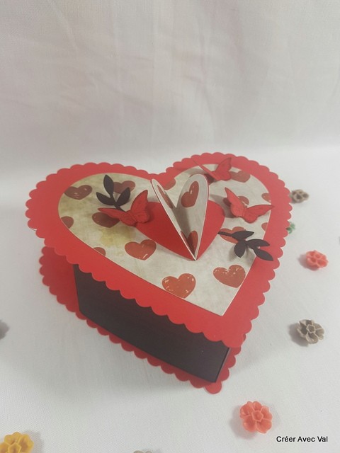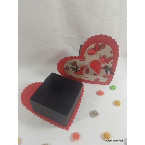 Une boîte de forme cœur avec un couvercle amovible ... le dessus est décoré d'un cœur en papier imprimé, et d'un cœur en relief, de papillon et de feuillage.