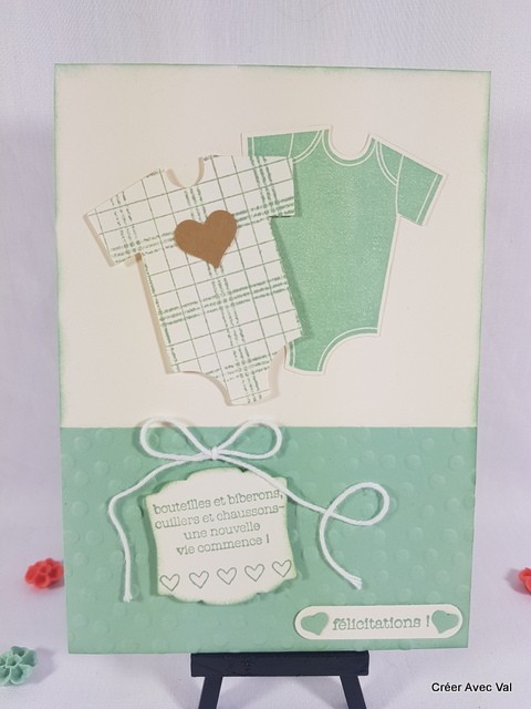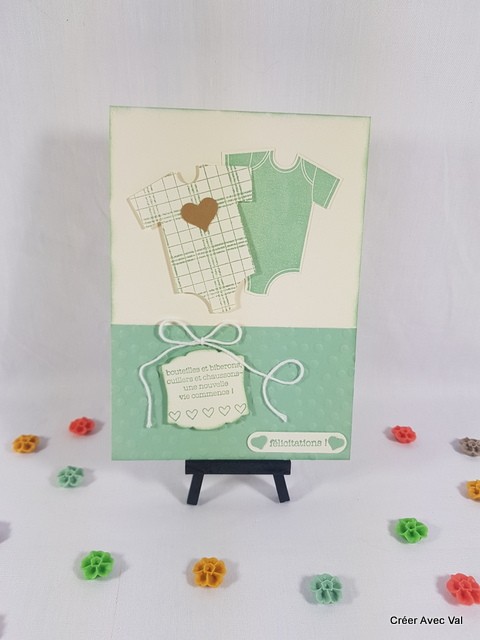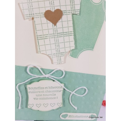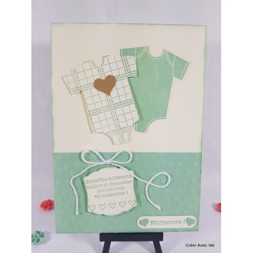 Le fond de carte vanille, accueille un premier papier embossé à froid sur 1/3 de la carte environ, où se trouvent deux étiquettes à message pour souhaiter la bienvenue de bébé. Sur le haut de la carte se trouve deux bodys aux motifs différents.